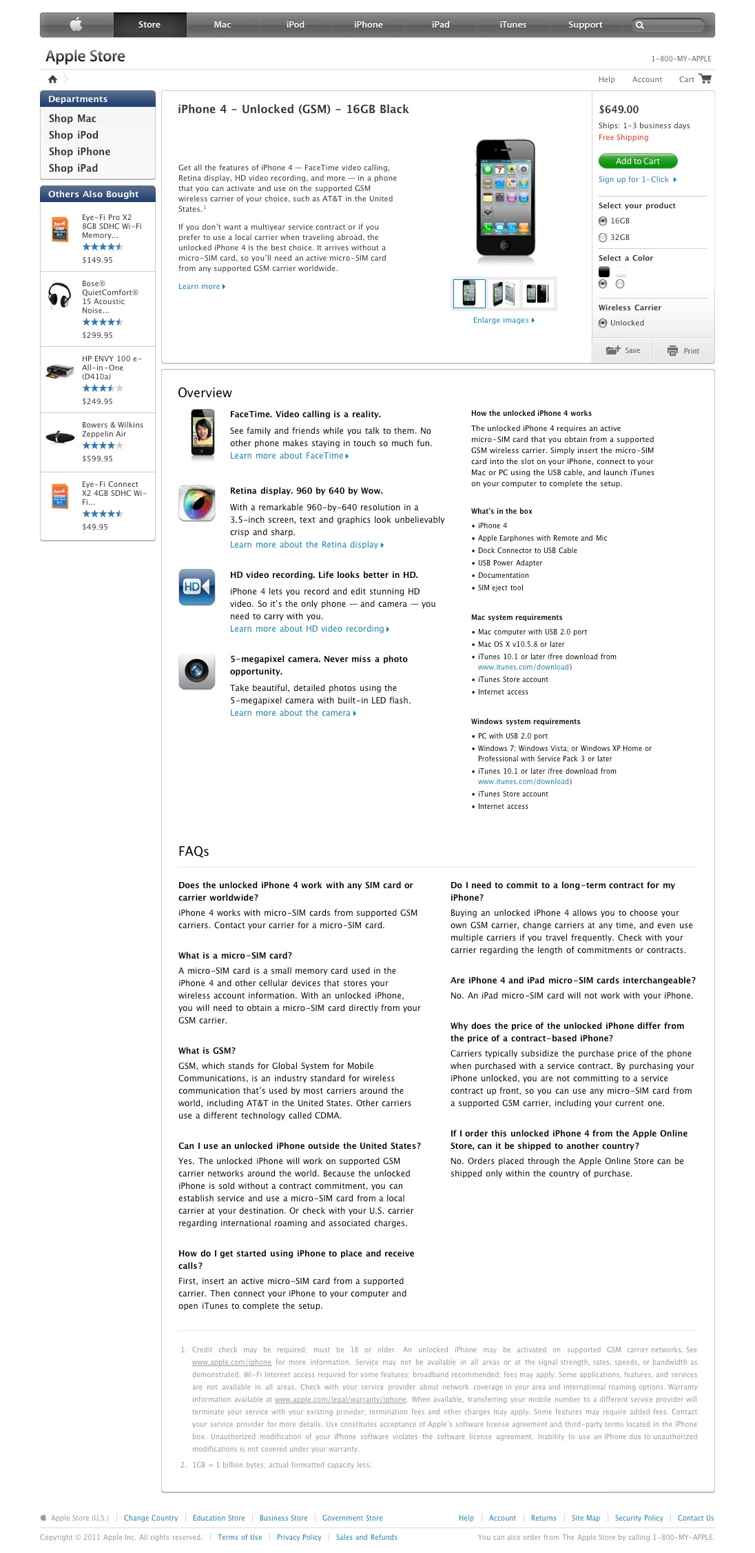 Apple 미국의 Apple Online Store에서, SIM 락을 해제한 iPhone 4 (GSM버전)을 판매하고 있습니다. 가격은, 16GB 모델이 649달러, 32GB 모델이 749달러 입니다.