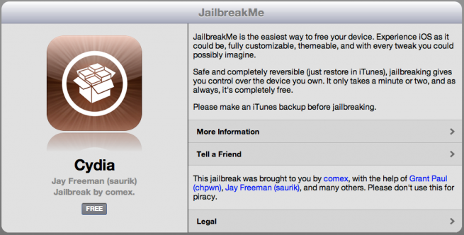iPhone Dev Team 멤버 comex가, 브라우저 기반의 제일 브레이크 서비스 JailbreakMe.com를 공개 했습니다. iPad 2 등의 기기에서 사용가능하며 Dev-Team Blog에 의하면, 아래의 iOS 기기를 지원한다고 합니다.