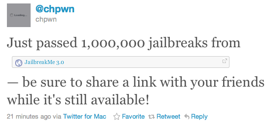 JailbreakMe.com을 통한 탈옥 건수 100 만건 돌파 2011년 07월 08일 작성자: KMUG 케이머그 브라우저를 이용한 탈옥 서비스 JailbreakMe 3.0이 릴리즈되며 무려 20시간만에 탈옥 건수가 100 만건을 돌파한 것으로 전해지고 있습니다. 관련기사 😕9TO5 Mac 공유: X에 공유 (새 창에서 열림) X Facebook으로 공유하기 (새 창에서 열림) Facebook Pinterest에 공유 (새 창에서 열림) Pinterest 친구에게 이메일로 링크 보내기 (새 창에서 열림) 전자우편 Threads에 공유 (새 창에서 열림) Threads Bluesky에 공유 (새 창에서 열림) Bluesky 이것이 좋아요:좋아하기 가져오는 중... 관련 KMUG 케이머그에서 더 알아보기 구독을 신청하면 최신 게시물을 이메일로 받아볼 수 있습니다. 이메일 주소 입력… 구독