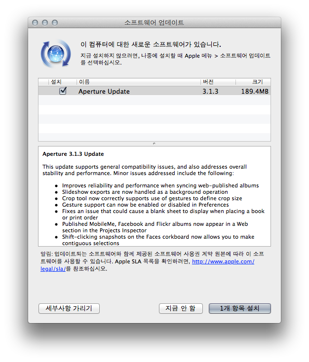 Improves reliability and performance when syncing web-published albumsSlideshow exports are now handled as a background operationCrop tool now correctly supports use of gestures to define crop sizeGesture support can now be enabled or disabled in PreferencesFixes an issue that could cause a blank sheet to display when placing a book or print orderPublished MobileMe, Facebook and Flickr albums now appear in a Web section in the Projects InspectorShift-clicking snapshots on the Faces corkboard now allows you to make contiguous selectionsMetadata presets are now correctly applied to imported audio filesFixes an issue that could cause Aperture to quit unexpectedly when trimming audio in full screen modeResolves various issues when adding names to Faces using accented, Japanese, Korean or Simplified Chinese charactersImproves stability when browsing video clipsAddresses reliability of library repair and rebuildThe update is recommended for all users of Aperture 3.