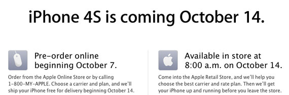 Apple사에서 온라인으로 미국 시간 10월 7일(금)오전 0시 1분부터 iPhone 4S의 예약 주문 접수를 실시한다고 안내하고 있습니다.