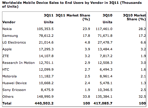 가드너는 2011년 3분기 세계 휴대 전화 시장에서의 엔드 유저 점유률을 발표 했습니다.