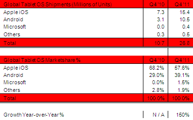 Strategy Analytics는 2011년 4분기 태블릿 판매 조사 결과를 발표 하고 있습니다. 총 4분기 동안 판매된 태블릿 PC 2680만대 중, iPad는 57.6%로 점유율 과반수를 차지하고 있다고 전하고 있습니다.