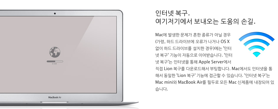 Lion 복구에 대한 추가 정보를 보려면 다음 웹 사이트를 방문하십시오. http://www.apple.com/kr/macosx/recovery/