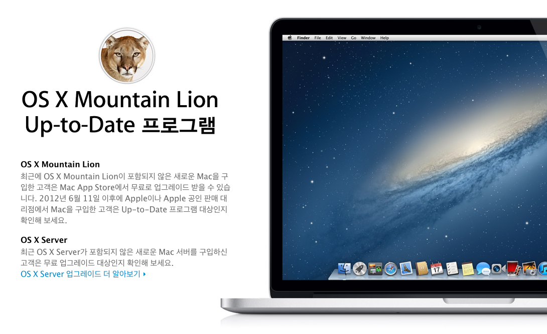 2012년 7월 26일 이후에 Apple Online Store 및 Apple 공인 판매 대리점에서 OS X Mountain Lion이 포함되지 않은 적용 대상 새로운 Mac 컴퓨터를 구입했거나, 혹은 Apple Online Store에서 OS X Mountain Lion이 포함되지 않은 Apple 공인 리퍼 컴퓨터를 구입한 고객은 무료 OS X Mountain Lion 업그레이드를 받을 수 있습니다.