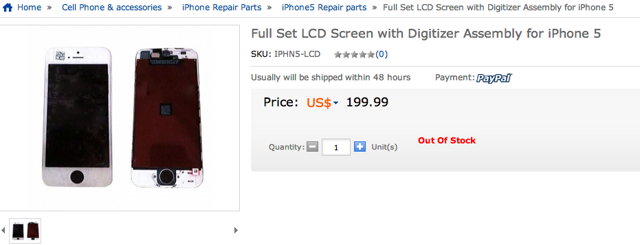 China Gadget Land은 iPhone 5의 것으로 추정되는 전면 풀 세트를 199.99달러에 판매하였다고 합니다. (현재는 품절.)