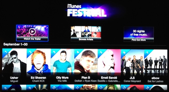 Apple은 Apple TV에 한국 시간으로 9월 2일(일) 부터 30일간 영국 런던 Roundhouse에서 진행되는 iTunes Festival 2012의 라이브 스트리밍 서비스 항목을 추가 제공 하고 있습니다.
