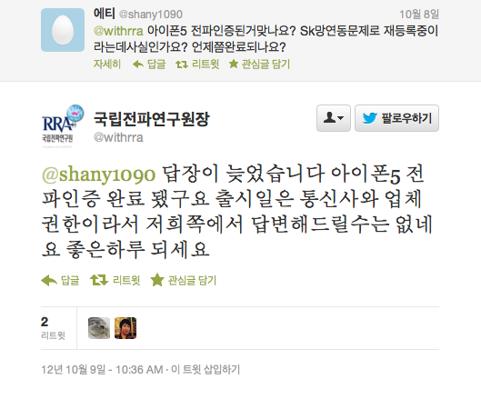 한 유저의 질문에 국립전파연구소원은 트위터로 iPhone 5의 전파 인증은 완료 되었다며 코멘트하고 있습니다.