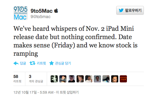 9to 5Mac에 따르면, iPad mini는 11월 2일 부터 출고 될지 모른다며 전하고 있습니다. 하지만 이 정보는 루머이므로 아직 정확하지는 않습니다.
