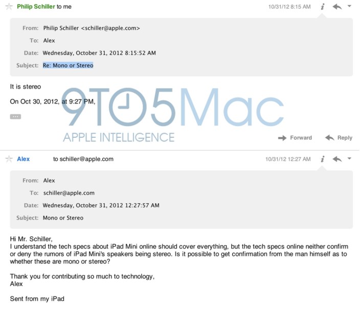 9to5Mac에 따르면, ALEX라는 유저가 Apple의 Phil Schiller에게 Amazon.com에 게제된 Kindle Fire HD와 iPad mini 비교표(현재는 삭제 되었습니다.)에 iPad mini는 모노 스피커를 지원한다고 하는데 실제로 어떤 스피커가 채용됐는가 하는 질문에, Schiller는 iPad mimi의 스피커는 스테레오라고 아주 간결하게 답하고 있습니다.