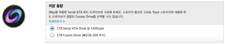 지금까지 iMac 27형(Late 2012)에서만 선택 가능한 1TB Fusion Drive가 iMac 21.5형(Late 2012)모델 에서도 선택 가능하도록 업데이트 되었습니다. 추가 금액은 33만 6천 5백원입니다.