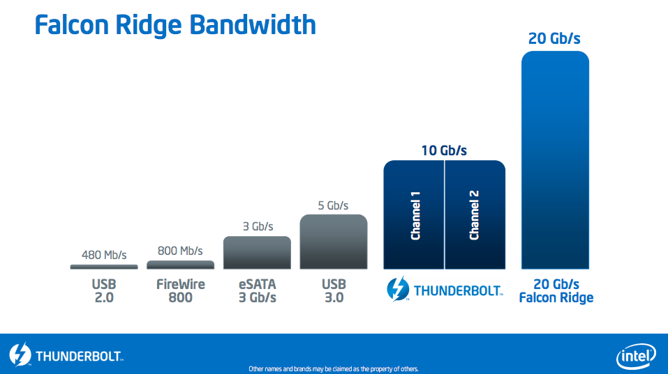 코드 명 Falcon Ridge( PDF )라고 하는 새로운 Thunderbolt 컨트롤러는 2채널에서 전송 속도 20Gbps를 실현하고 있으며, 이를 통해 4K 시네마 워크 플로우를 Thunderbolt 연결로 실현하는 것이 가능하게된다고 설명하고 있습니다. 4세대 Intel Core 프로세서의 일부에 포함되며 2013년 말부터 출시 될 예정이라고합니다.