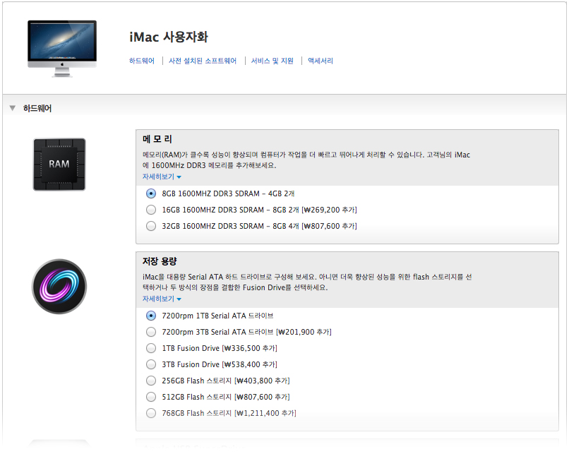 Apple Onlie Store에 iMac(Late 2012)의 사용자화 옵션으로 256GB와 512GB 플래시 스토리지 옵션을 추가합니다. 이전에는 iMac(21.5-inch, Late 2012)모델의 경우 플래시 스토리지가 포함되지 않았으며, iMac 27-inch, Late 2012)는 768GB 플래시 스토리지 밖에 추가 할 수 없었습니다.