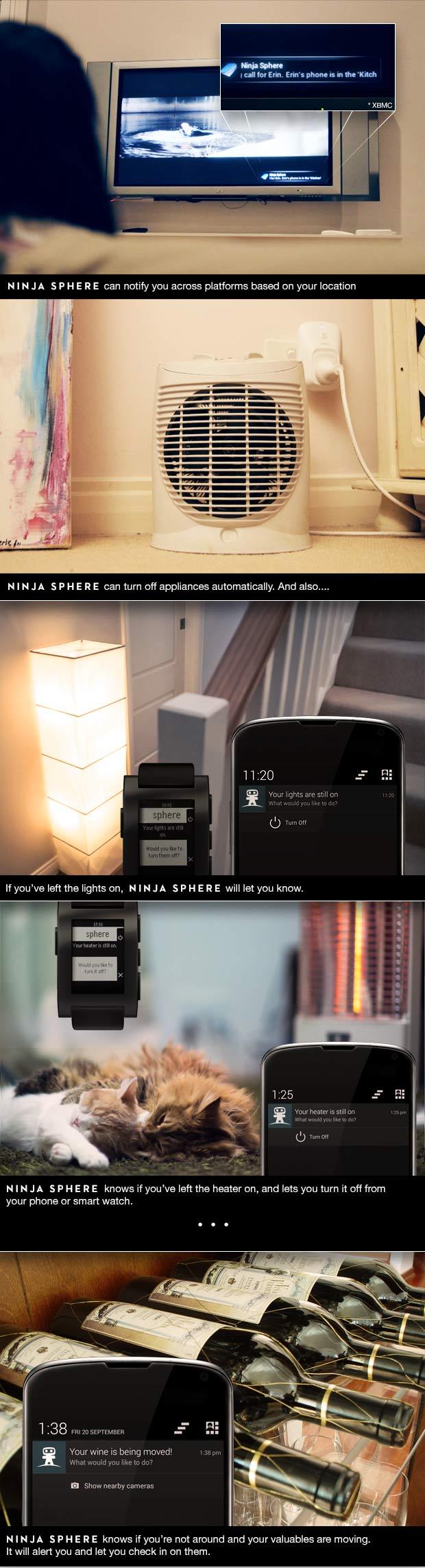 영상을 보면 애완동물의 목에도 연결 기기를 달아서 집안 어디에서 움직이는지 확인할 수 있고, NINJA SPHERE와 연결된 손목 시계의 조작으로 집안의 전자 기기를