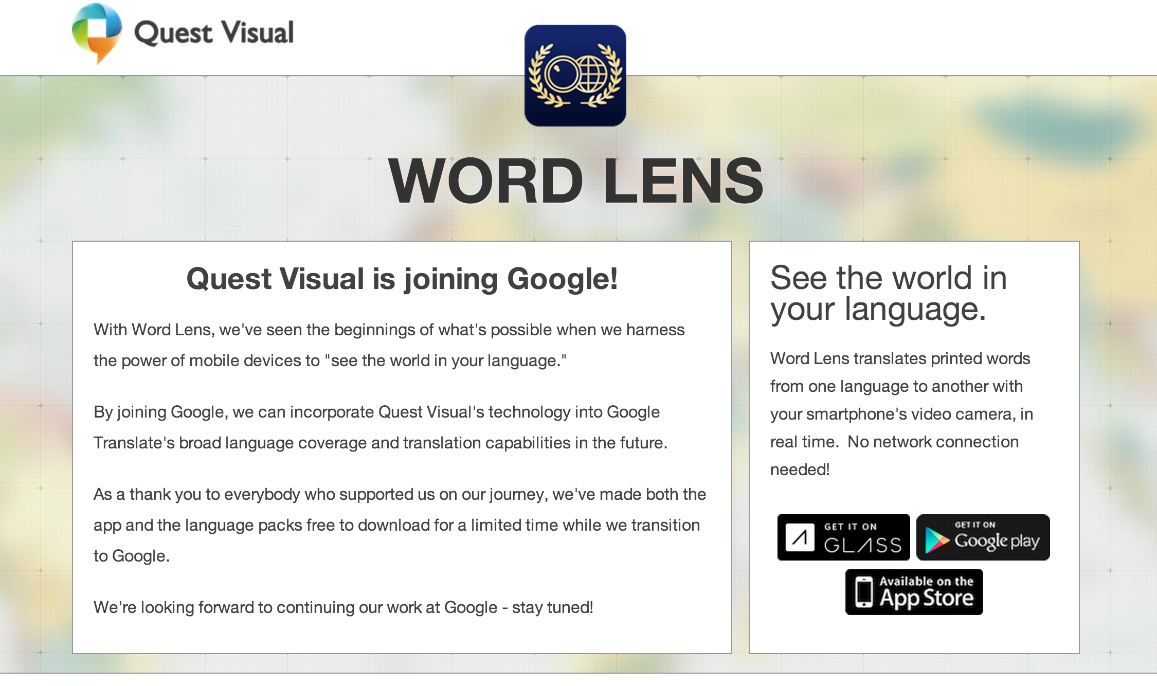 iOS 어플인 Word Lens를 개발하는 Quest Visual이 Google에 인수 되었다고 전해지고 있습니다.