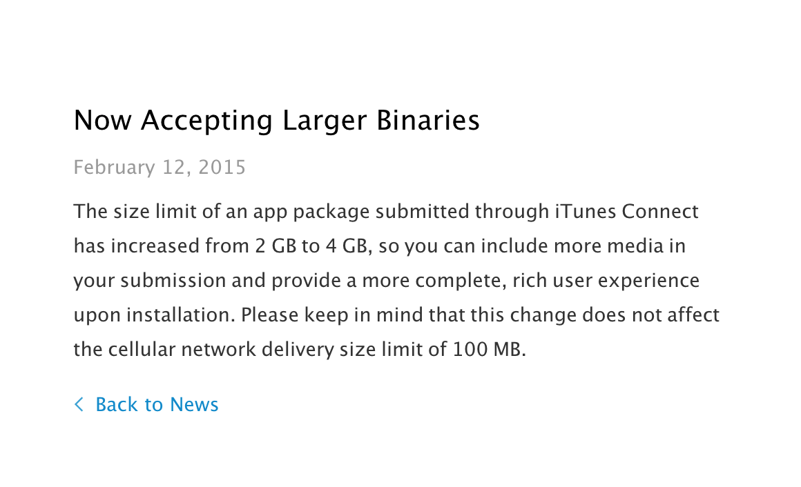 Apple은 App Store에서 제공하는 응용 프로그램 패키지 크기 제한을 2GB에서 4GB로 올렸다고 발표하고있습니다.