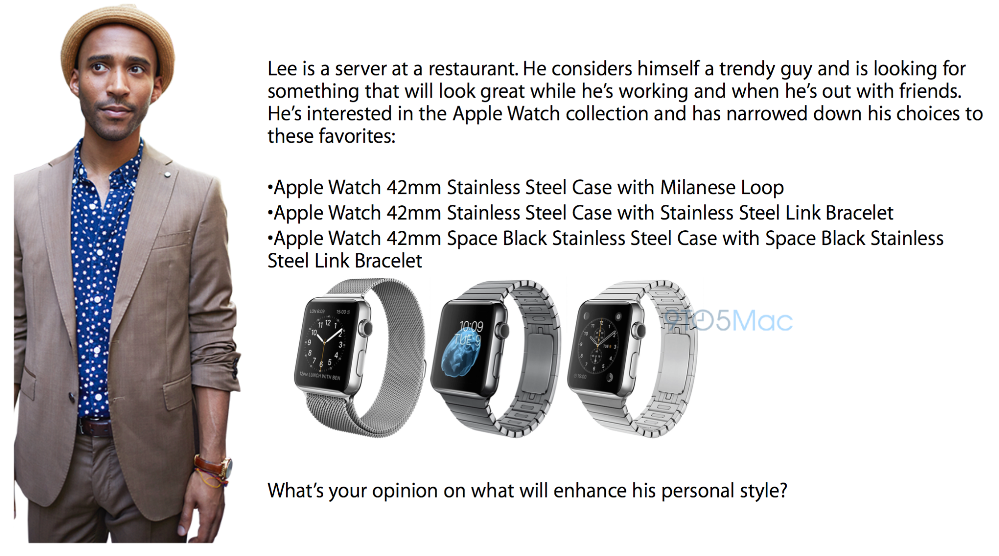 9to5Mac는 Apple 직영점 직원 용으로 전달되고 있는 Apple Watch 영업 교육 프로그램의 내용에 대한 자세한 내용 전하고 있습니다. 내용에 따르면, 직원들은 Apple Watch 기능뿐만 아니라 고객의 패션과 스타일링에 대한 조언도 코칭할 수 있도록 훈련되고 있다고 합니다.