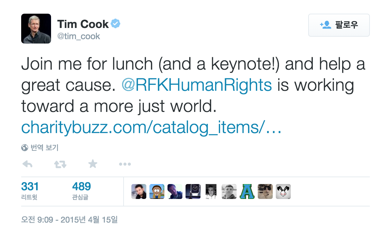 이 Charitybuzz 경매는 인권 단체 The Robert F. Kennedy Center for Justice & Human Rights를 지원하기위한 것으로, 팀 쿡은 2013년 부터 협력하고 있었습니다.