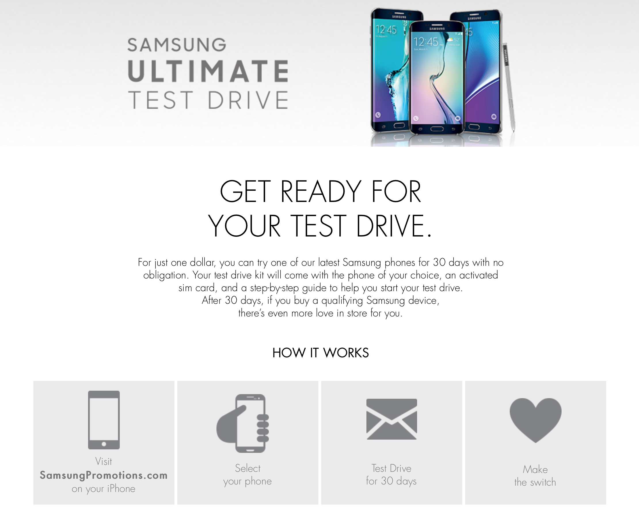 삼성은 애플의 iPhone을 사용하는 사용자들 대상으로 단 돈 $1로 자사의 갤럭시 제품을 한달간 사용해 볼 수 있는 얼티메이트 테스트 드라이브를 실시하고 있습니다.