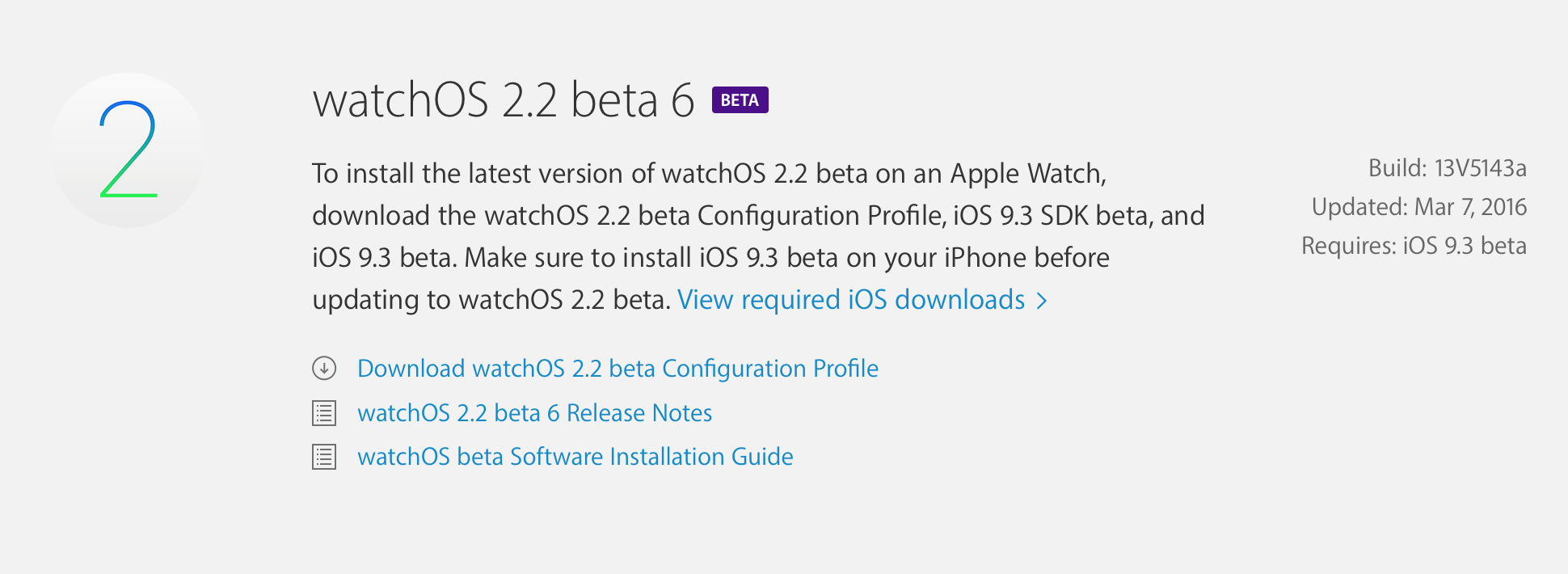 | Apple은 watchOS 2.2 beta 6 (빌드 13V5143a)를 개발자에게 공개하였습니다. watchOS 2.2에서 iOS 9.3을 실행하는 하나의 iPhone에서 다수의 watchOS 2.2가 동작하는 Apple Watch와 페어링 할 수 있도록되어 있습니다. 또한, 지도 앱은 현재 위치에서 집이나 직장에 대한 경로 검색 바로 가기가 추가되어 있습니다. https://developer.apple.com/watchos/download/ http://kmug.co.kr/board/zboard.php?id=applenews&no=6332&scode=kb |
