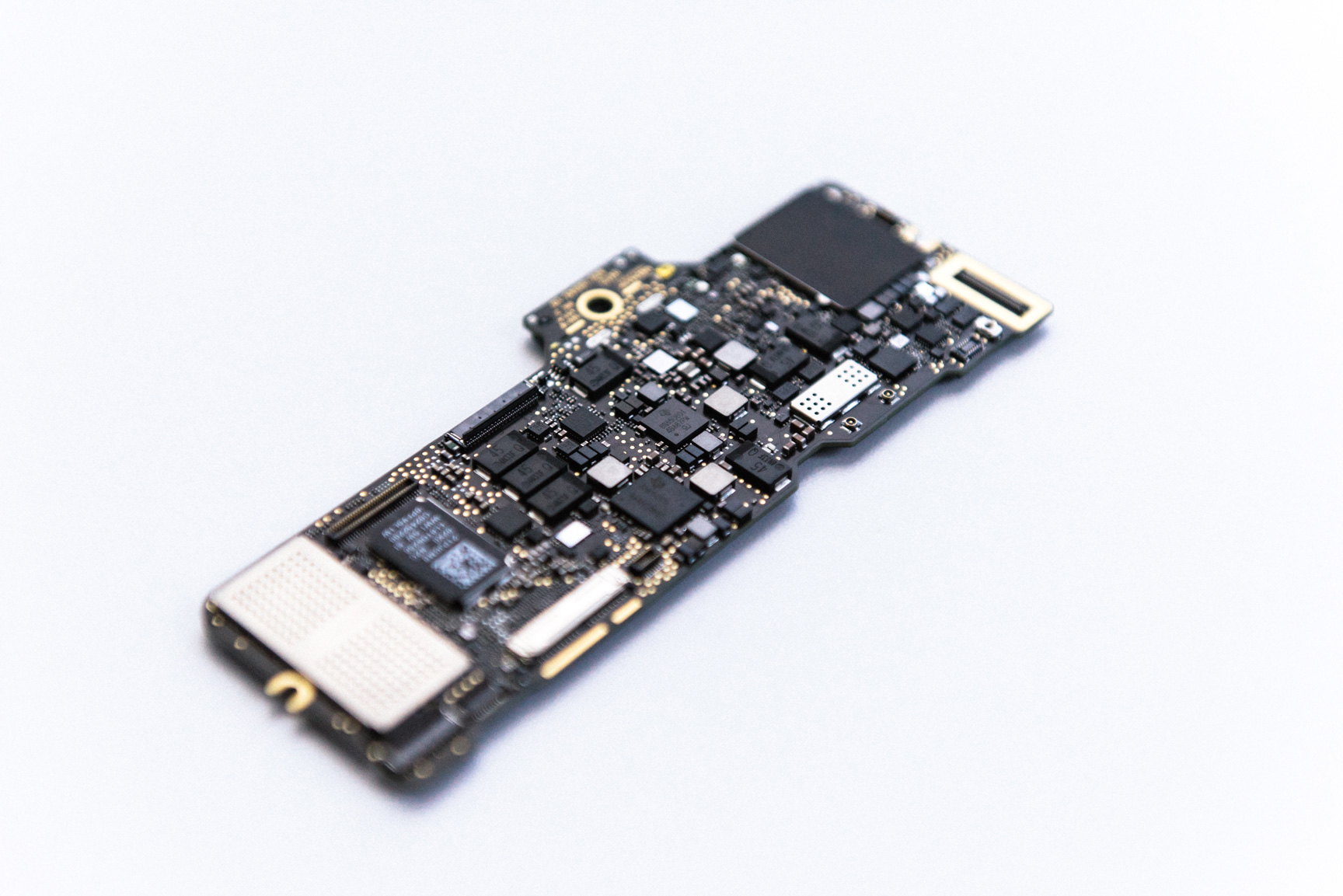 The MacBook motherboard is the smallest and densest Apple has ever made for a laptop. Both sides are covered in logic.