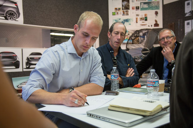 왼편에는 최근 피터 멀린(Peter Mullin)의 미완성 Type 64 Bugatti의 몸체를 디자인했던 운송수단 디자인과의 스튜어트 리드(Stewart Reed)와 함께, Fisker와 Rivian, LA의 증강현실 기업인 Daqri에서 일했고 대학원에서 운송시스템과 디자인을 강의하는 팀 헌칭거(Tim Huntzinger) 교수도 있었다. 교수이자 최초의 마우스 스크롤휠의 발명자인 팀 브루어(Tim Brewer), 인테리어 전공이지만 현재 폴크스바겐에서 인턴인 디 바오(Di Bao), 항공공학 석사로 최근 졸업했고 제트추진연구소(JPL)에서 인턴중인 아카시 추다사마(Akash Chudasama)도 앉았다. 오른편에는 개인 이동 장비에 관심이 있으며, 우리의 애플카 디자이너가 되어준 가렛 데브리(Garrett DeBry)가 그룹의 아이디어와 자신의 상상력을 한데 모아서 여기서 보실 이미지를 만들었다.