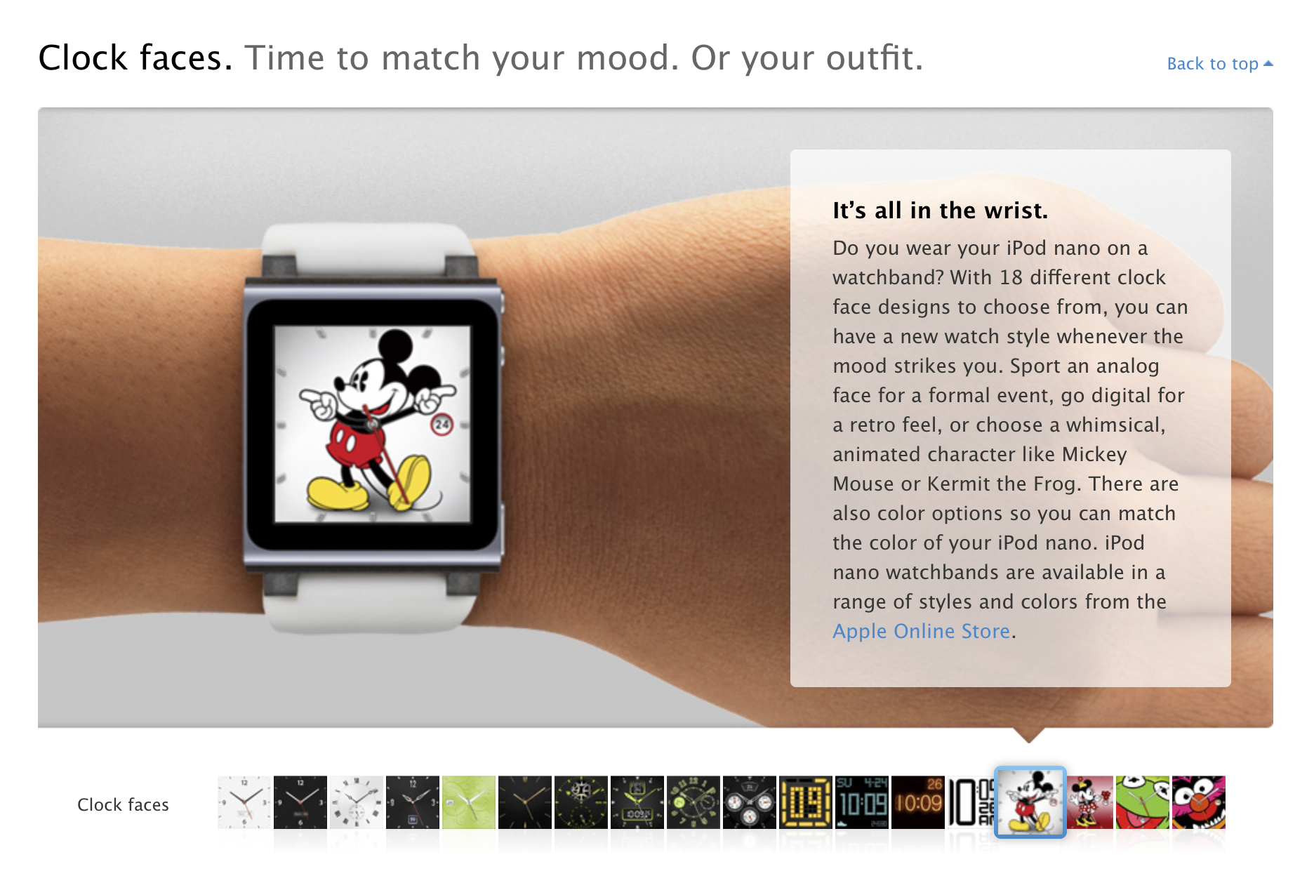 필 실러 애플의 세계 제품 마케팅 수석 부사장은 2011년 업데이트된 6세대 아이팟 나노를 선보이면서, 서드파티 시계줄을 소개했을 뿐 아니라 애플이 “그거 정말 재밌게 봤다”고 말했다. 그래서 애플은 시계로 착용할 때 고를 수 있도록 16개의 페이스를 추가시키기도 했다.