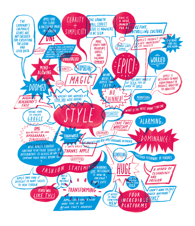 애플 임원진은 전통적으로 신제품을 내세울 때에만 인터뷰를 한다. 잡스는 종종 애플 제품 중 하나와 자신의 사진을 약속한 잡지하고만 협력했었다. 하지만 애플도 변화했다. 비단 홍보 부서만이 아니다. 애플은 네 가지 운영체제(애플 TV와 아이폰, 맥, 워치)만이 아니라 애플페이와 애플 뮤직과 같은 서비스, 심지어 아이폰 화면 상의 아이메시지 말풍선의 크기에 이르기까지 많은 것을 다루고 있다. 또한 온라인 앱스토어와 소매 스토어의 레이아웃도 다시 디자인했으며, 지도와 시리, 워치에 대해 급격한 변화를 이루고 있는 중이다. 앱 개발자들의 창조력이 매년 2,500억 달러 규모의 애플 생태계를 풍부하게 만든다는 사실을 알고 있기 때문에 개발자들에게 새로운 방식으로 구애하고 있기도 하다. 게다가 거의 분명히 자동차 생산 가능성도 검토하는 중이다. 이러한 움직임은 새로운 애플을 하나 하나 쌓아가고 있다.