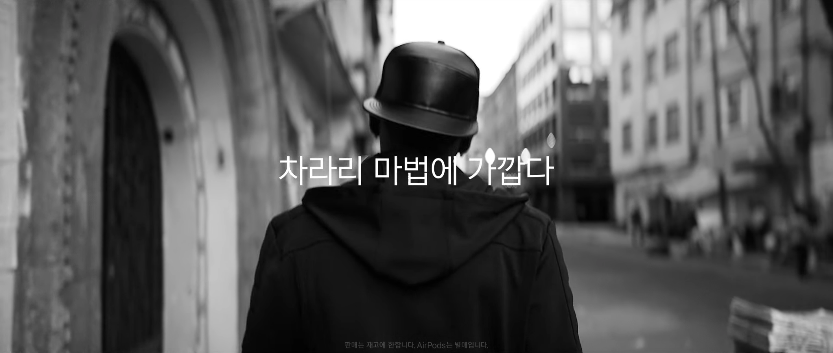 감각적인 음악과 연출로 Airpods을 선전하고 있습니다.