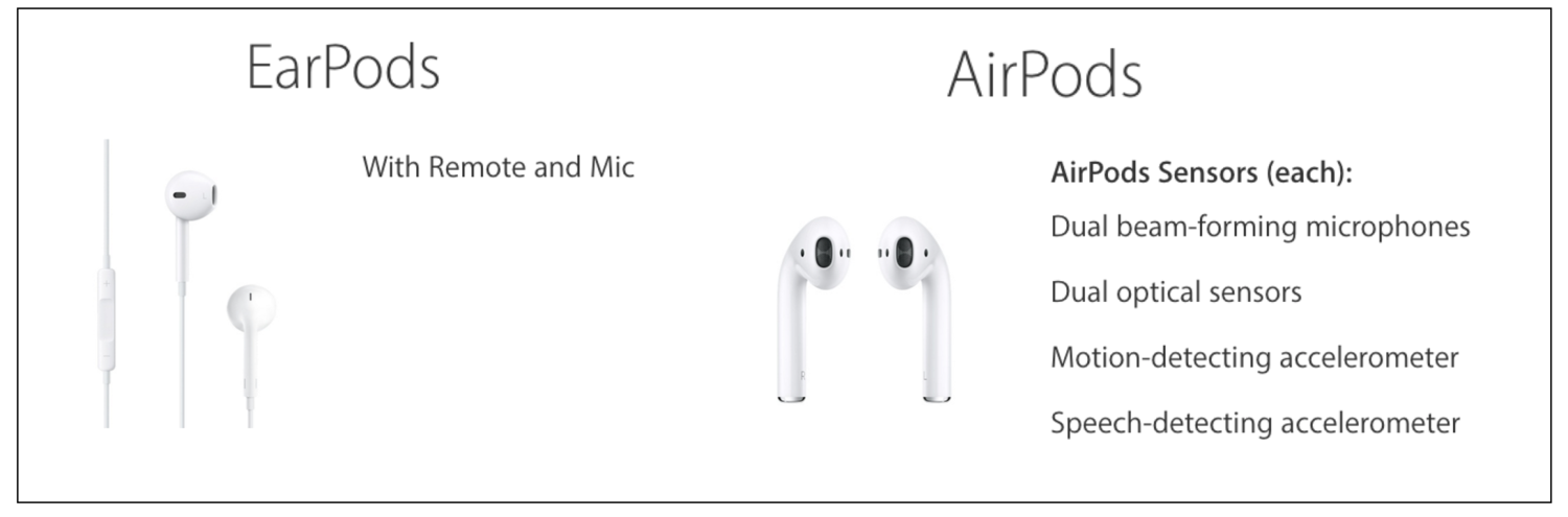 아이폰 사용자들이 미처 생각지도 못 한 문제점, 유선 헤드폰의 해결책으로서, 애플은 $159에 에어팟을 소개했다. 유선 헤드폰으로부터의 이주에 속도를 더함으로써, 애플은 모바일 장비에서의 사용자 경험이 개선되리라 확신하고 있다. 에어팟은 현재의 유선 이어팟의 대부분의 역할을 하는 디자인이지만, 내부를 보면 애플이 이 장비로 훨씬 더 많은 것을 목표로 삼고 있음을 알 수 있다. 애플 최초의 무선 칩인 W1 칩은 무선 헤드폰에 있던 전통적인 단점을 다루고 있다. 그렇지만 W1 칩에 음성 가속도계처럼 추가적인 센서가 붙을 경우 에어팟은 애플의 시리를 활용하는 최신 제품이 될 것이다.