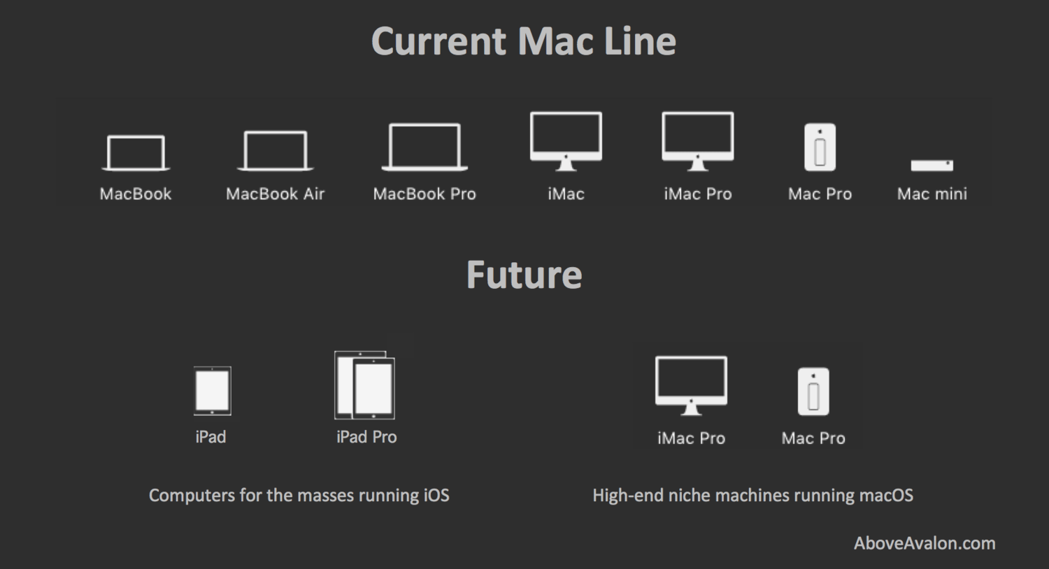 올해 WWDC 기조연설은 맥의 미래에 대해서도 좀 알려줬다. 맥 사용자들 중 상당수는 아이패드 프로 정도로 컴퓨팅에 대한 수요를 충족할 수 있을 것이다. 애플에 따르면 대략 현재 맥 사용자의 70–85%는 전문적인 맥 소프트웨어에 의존하지 않는다. 즉, 이 비중은 약 8천만 명에 해당한다. 이들 사용자들은 앱 개발자가 아니며, 맥북 프로나 아이맥 프로, 맥 프로의 힘을 필요로 하지도 않는다. 그 대신 이들은 키보드가 달린 맥이라는 점 때문에 맥을 사용하는 이들이다.