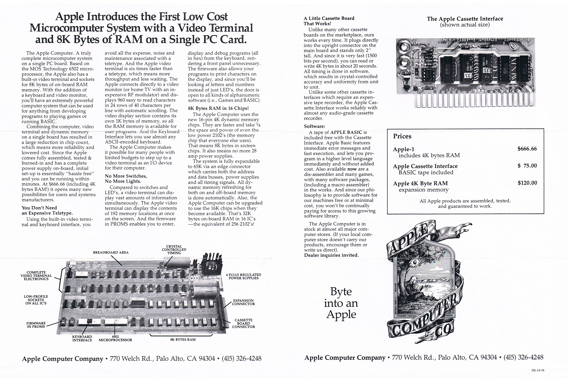6월 레지스 맥케나(Regis McKenna) 광고 회사에 애플 컴퓨터 광고를 맡기자, 이 컴퓨터에 대한 일반인들의 관심이 모아지기 시작했습니다. 그후 추종자들에 의해 Apple I 보드 50개는 바이트 컴퓨터 상가에서 컴퓨터 및 전자광들에게 $666.66에 판매되기 시작하면서 기대했던 것 이상의 판매고를 올리기 시작 했습니다.