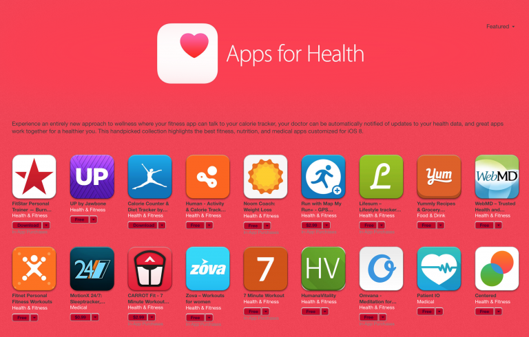 iTunes에서 iOS 8 전용 건강 관리 응용 프로그램을 소개하는 페이지를 공개하고 있습니다. https://itunes.apple.com/WebObjects/MZStore.woa/wa/viewFeature?cc=us&id=905188867&mt=8