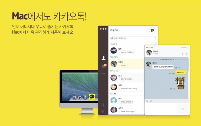 카카오톡 2.0.0 업데이트, OS X 버전 2.0.0 버전의 새로운 기능 – 페이스톡 서비스 오픈 – 채팅방 대화내용 복사/붙여넣기 지원 : 말풍선 여러 개를 드래그한 후 복사하기가 가능해졌어요. ** 로그인이 안되거나, 앱 업데이트가 안되는 문제를 겪으신다면 Mac 리부팅 혹은 Mac OS를 엘케피탄 이상 버전으로 업데이트 해주셔야 합니다. https://itunes.apple.com/kr/app/kakaotog/id869223134?mt=12 http://www.kakao.com/services/8/pc