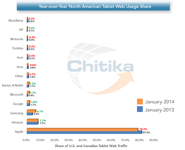 삼성 작년대비 56%, 마소 325% 상승 하지만.. 시장조사기관 Chitika에 의하면, 애플은 북미에서의 태블릿 트래픽 80%를 차지하고 있습니다. (작년대비 소폭 하락) 삼성은 3.9%에서 6.1%로 56% 상승, 마이크로소프트는 0.4%에서 1.7%로 4배 이상 상승하였다고 밝히고 있습니다. 그러나, 그래프를 보시면 아시겠지만 아직 애플의 경쟁자는 없어보입니다. http://tech.fortune.cnn.com/2014/01/27/apple-chitika-tablet-traffic/
